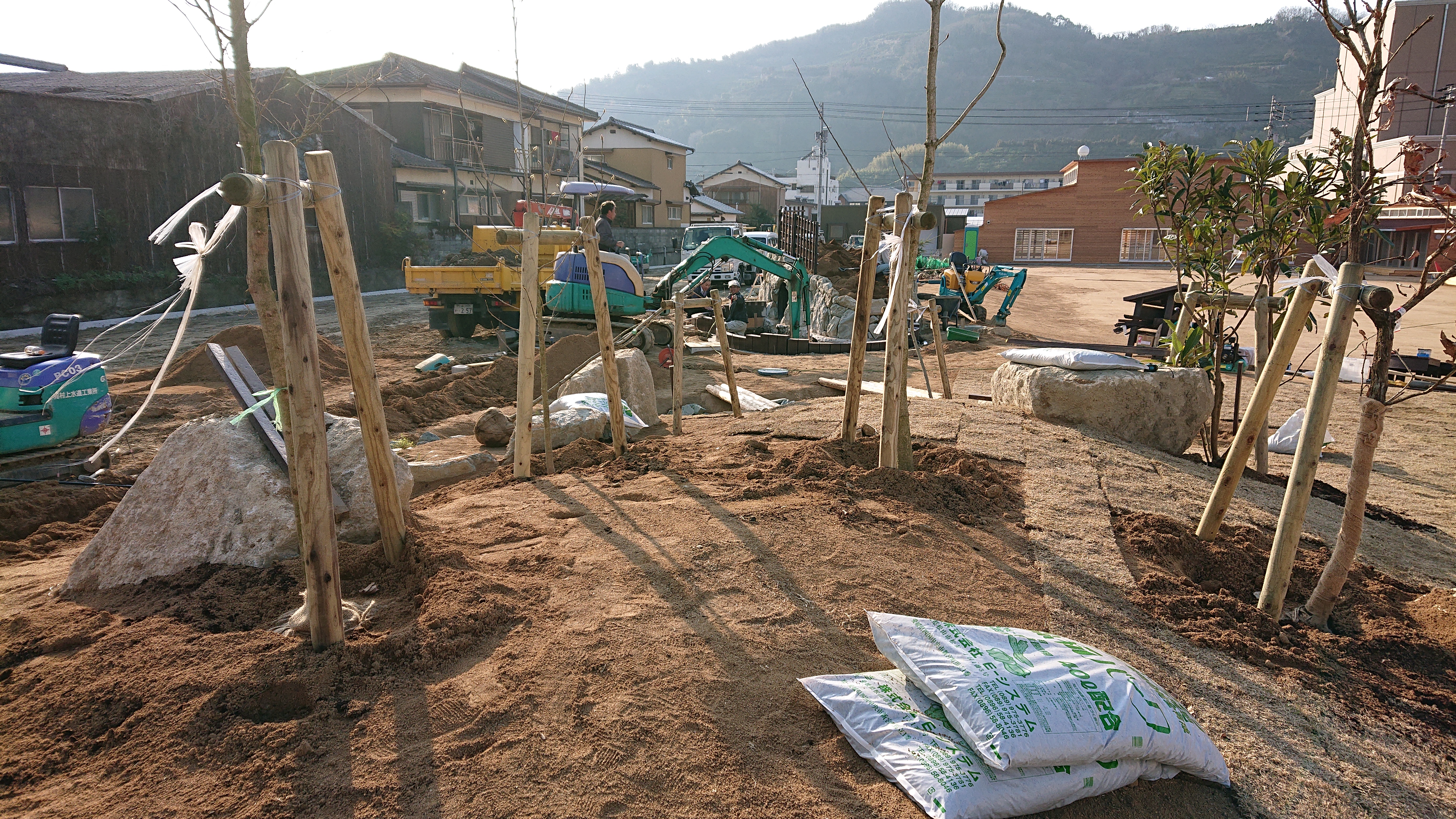 2019年02月25日 一体感! 現在、愛媛県八幡市内の新設の保育所で園庭工事をやっていますが、職人さんたちは、地元八幡浜と松山から来てもらって、合同チームで工事に取り組んでいます。 職人さんが多い日は、7名程が集まって一緒に作業をしました。 普段は、土木工事や造園工事をしている方々ですが、皆さん本当に園庭工事を楽しく、そして一生懸命取り組んでくれています。 今月末には、園庭の完成を迎えますが、 チームの一体感を崩すことなく、残り少ない時間をまだ見ぬ子どもたちために、一生懸命頑張っていきたいと思います。