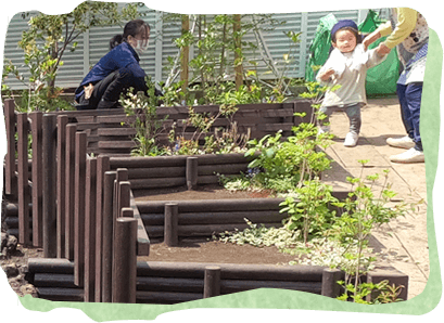 子どもたちが園庭で、草花あそびをするには、子どもの目線に近い低木や草花の存在が大切です。