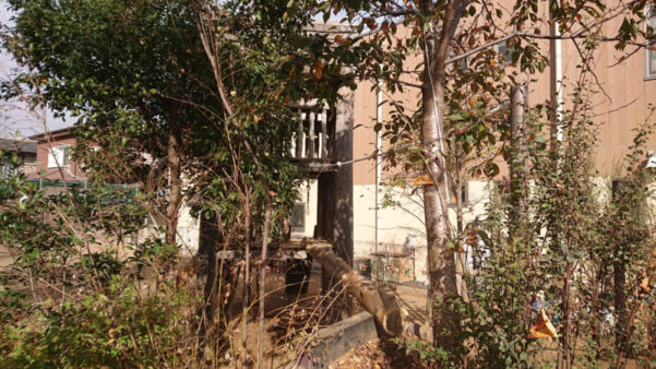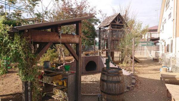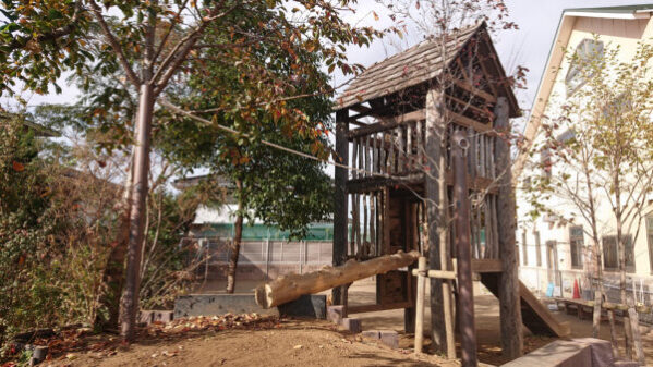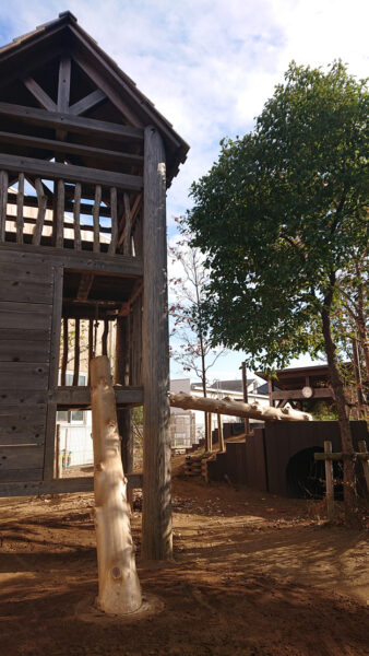 遊具に丸太の橋を架け、また別の面に丸太を斜めに立て掛けました。
