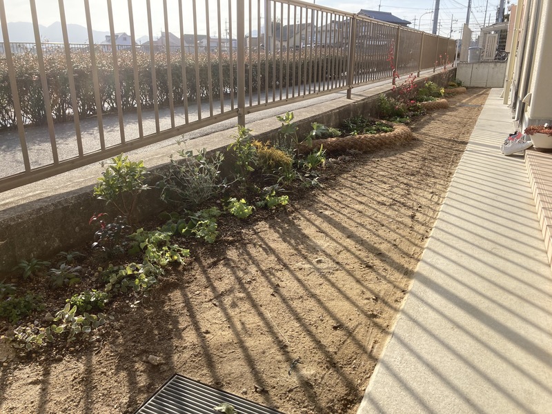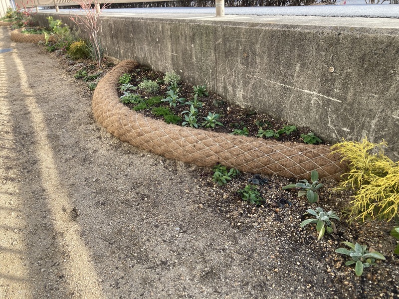 第二期工事のためのエリアと分けるように、低木を生垣代わりに植えています。