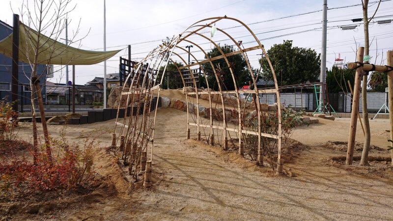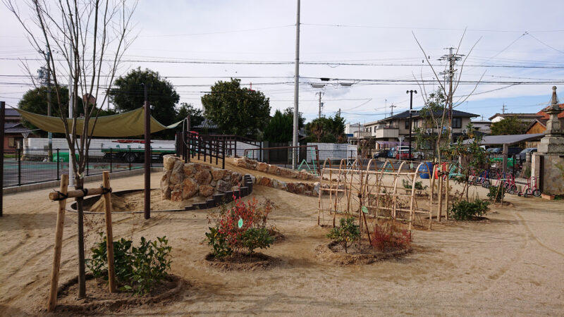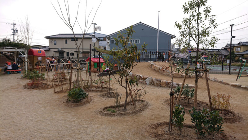 この他の園庭スペースを分ける、生垣的な意味を持つ植栽帯をつくりました。
