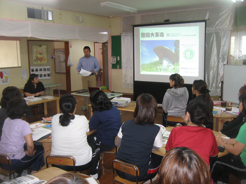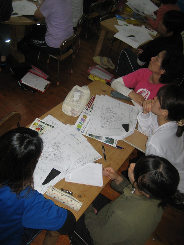 本来の園庭とはどうあるべきか、また身近な自然と豊かに関わる園庭づくりとはどういうものか等をご提案し、その後は第一案の計画をもとに、職員の方々との意見交換を行いました。