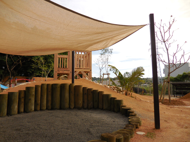乳児園庭では、沖縄の自然の中にある砂場と築山のイメージで、乳児さんたちがほっこり遊ぶことができる空間をつくりました。
