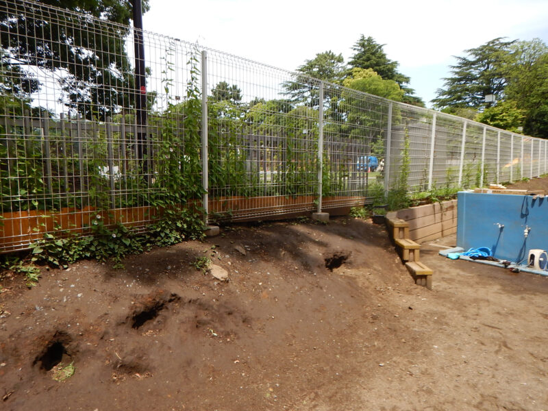 写真を見て頂くと分かるように擬木材を使って土留めすることで