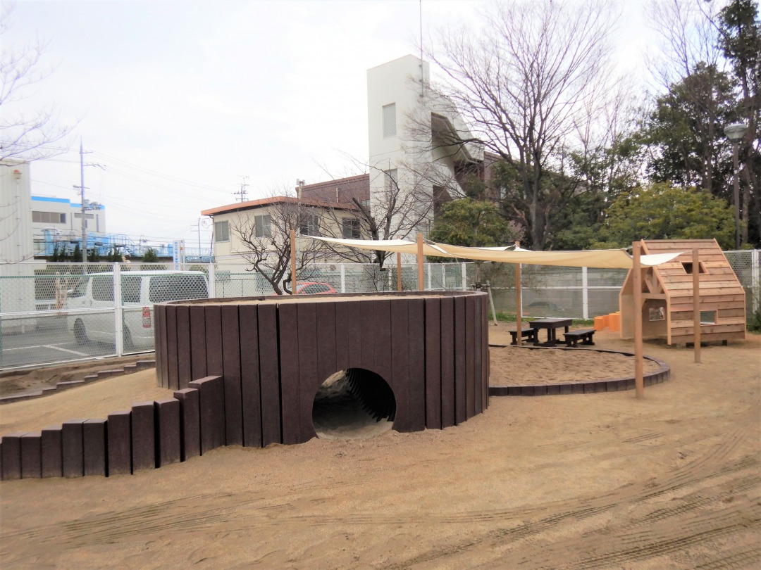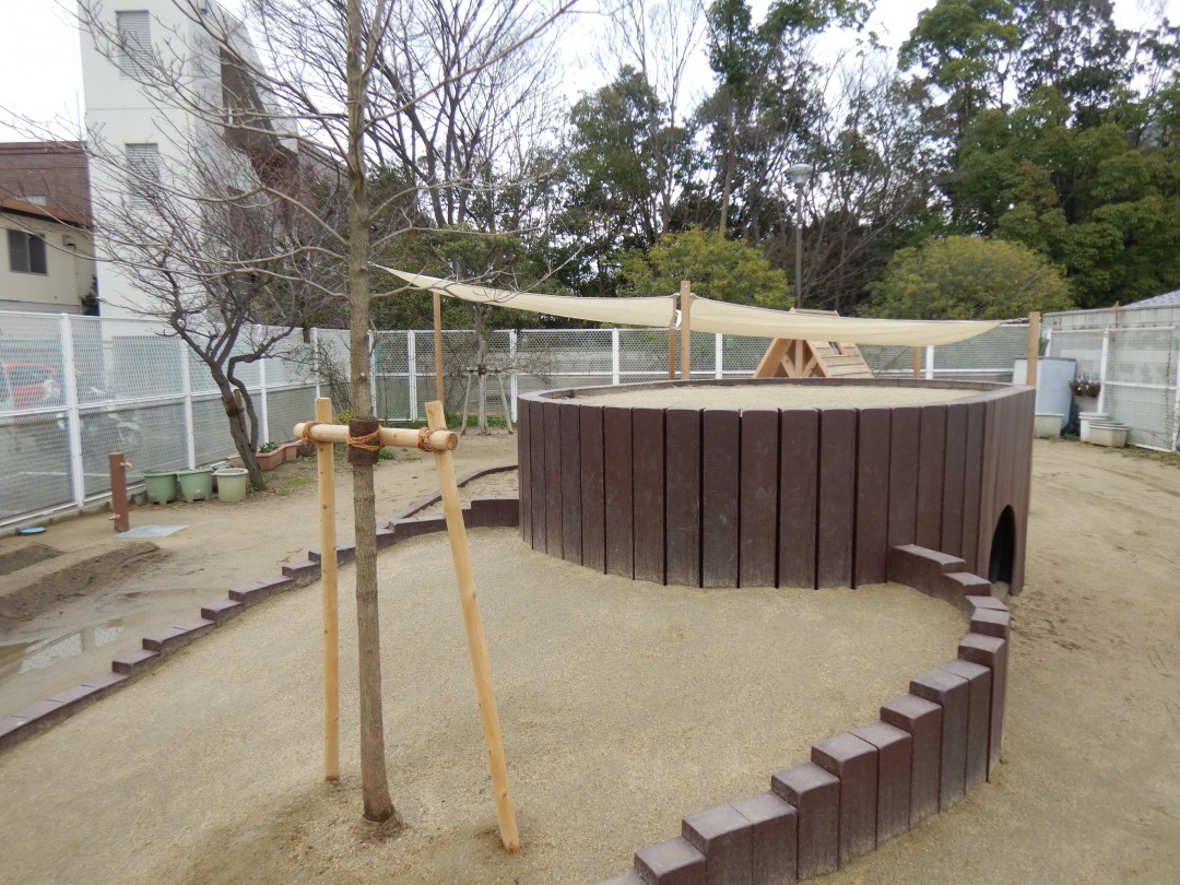 園庭のほとんどがグランドのように平坦だった園庭に、トンネルを仕込んだ築山とシェード付きの2段の砂場をつくり、それらの近くにとんがり屋根の小屋を置きました。