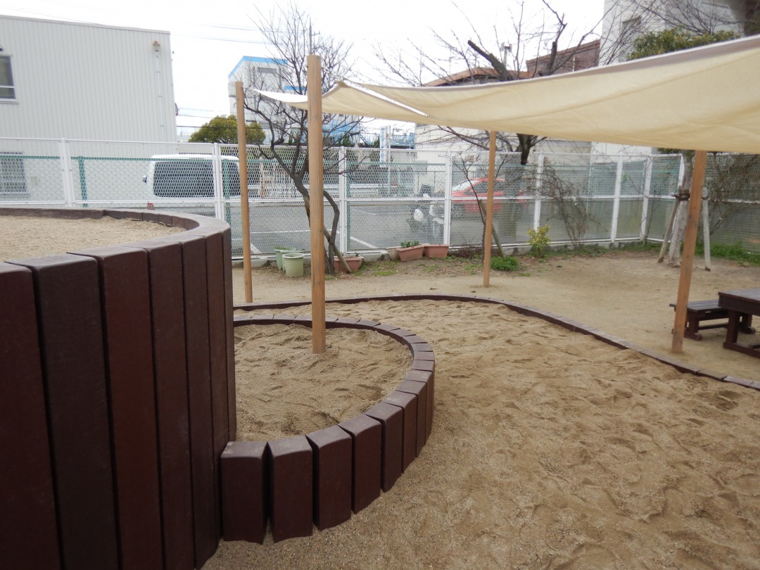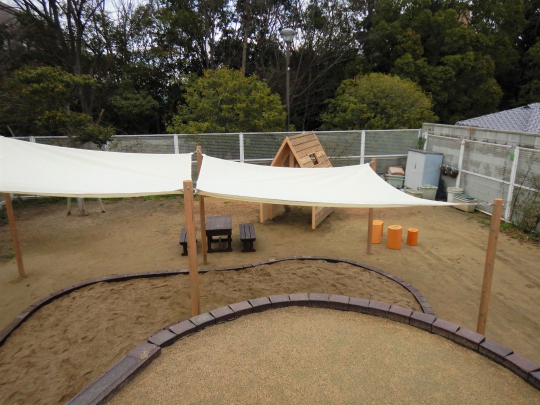 砂場の上には日よけのシェードがあります。この砂場にも小さな高低差を設けました。