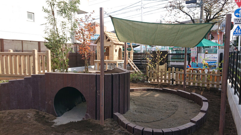 砂場、トンネル、傾斜、木製遊具、そして菜園スペースがあって