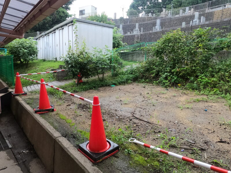 通常遊んでいる園庭の奥に、建物を撤去してそのままになっているスペースを