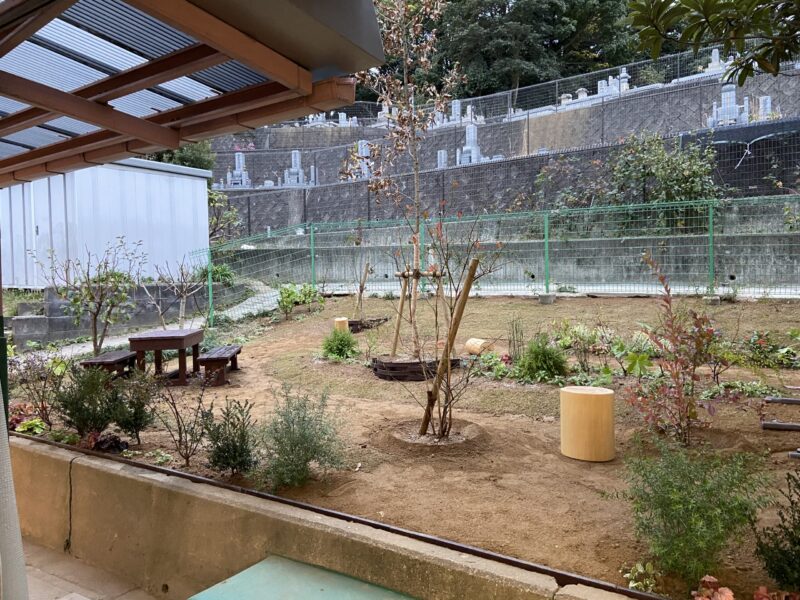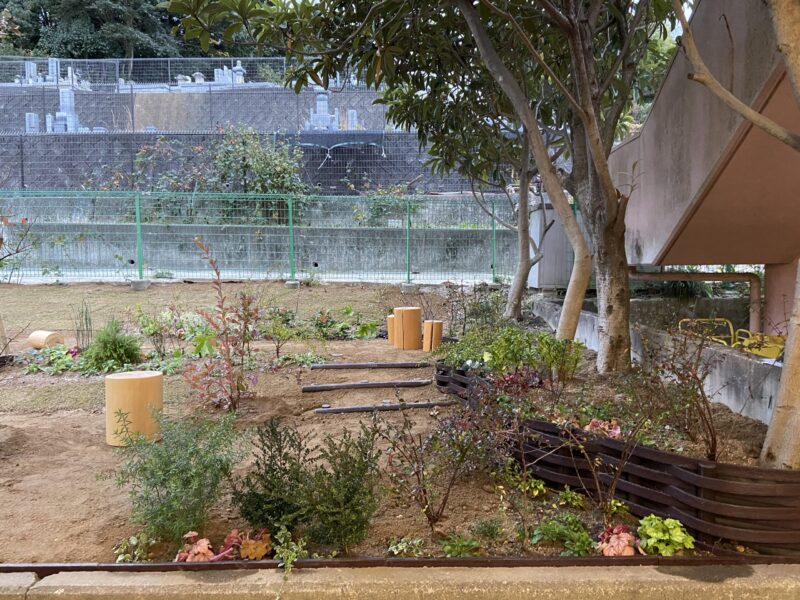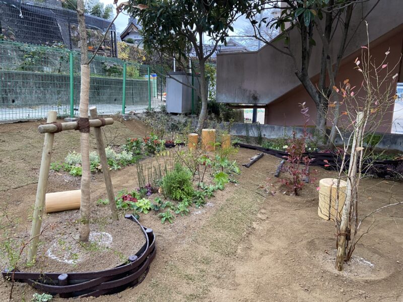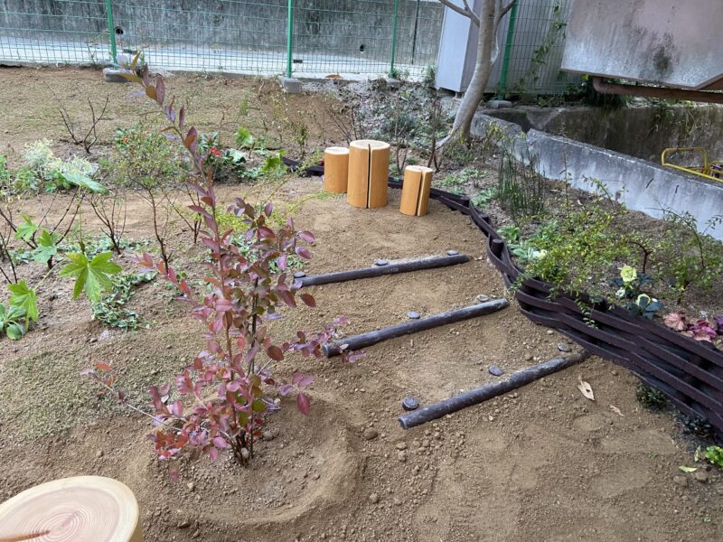 子どもたちが植物で楽しめる場所に、という先生方の思いから工事が始まりました。