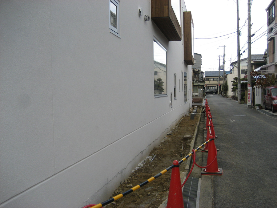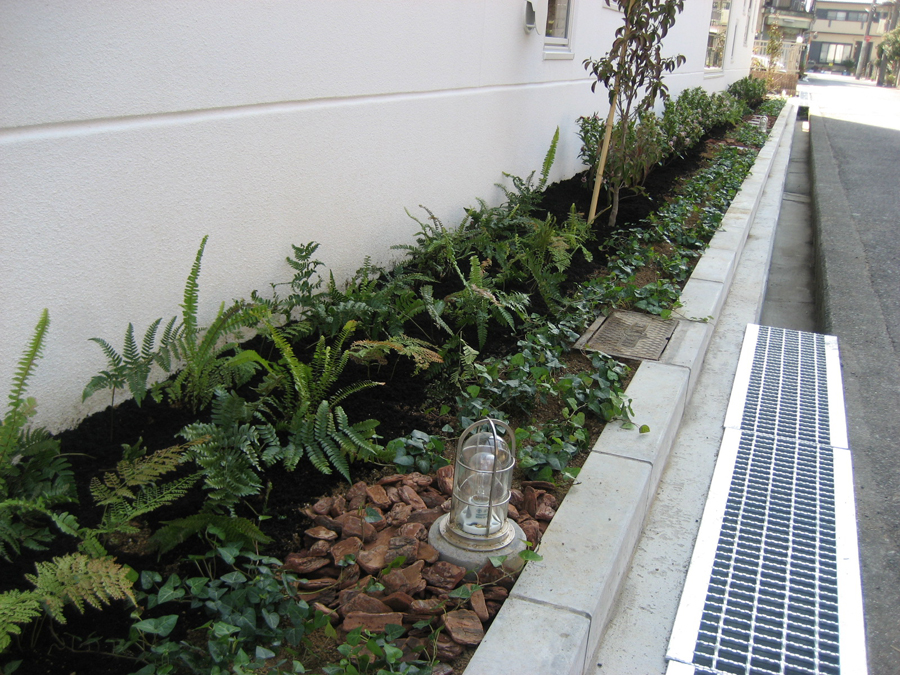 常緑ヤマボウシをポイントととし、その間には、ジンチョウゲ・3種のシダの混植とギボウシ・ハートヘデラを植えました。設備の周りにはウッドチップを敷き詰めました。