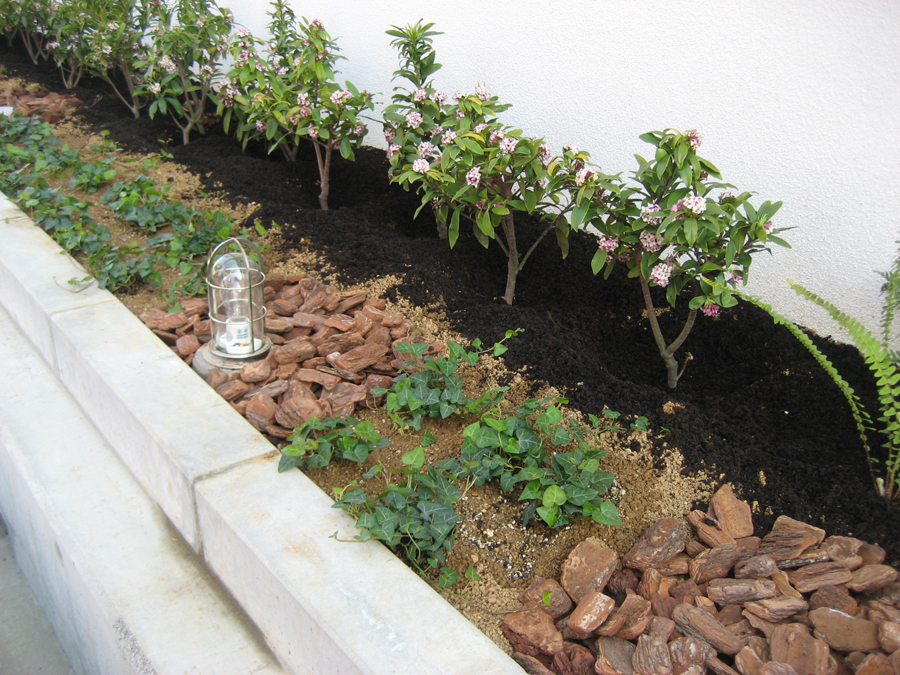 ちょうどジンチョウゲが香る時期と相まって、一挙に潤いのある空間に様変わりしました。「ご近所さんにもきっと喜ばれるでしょう」と園長先生にも気に入って頂けました。