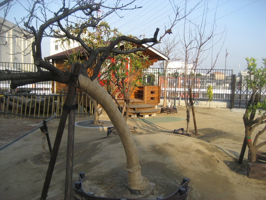 今回は、園舎建て替えに伴う園庭整備ですが、今からさかのぼること約1年前に園内の主な樹木の仮移植をして、この度ようやくそれら樹木を本植えしました。