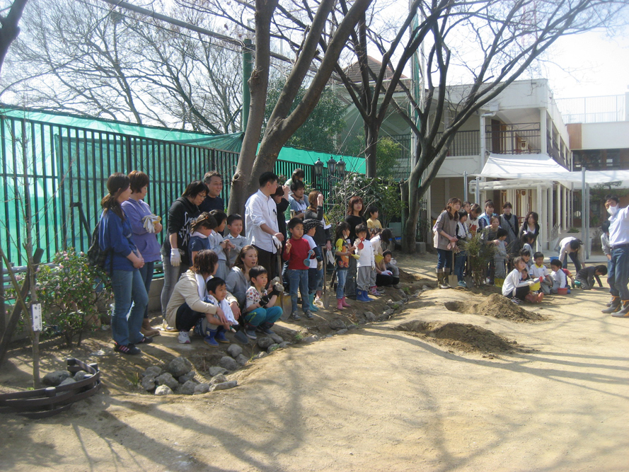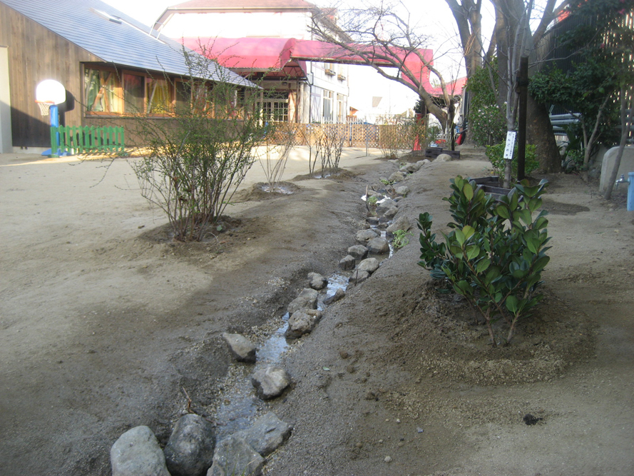 全長約15mのせせらぎビオトープづくりでは、卒園児クラスの親子参加イベントとして、みんなで楽しく作業をしました。