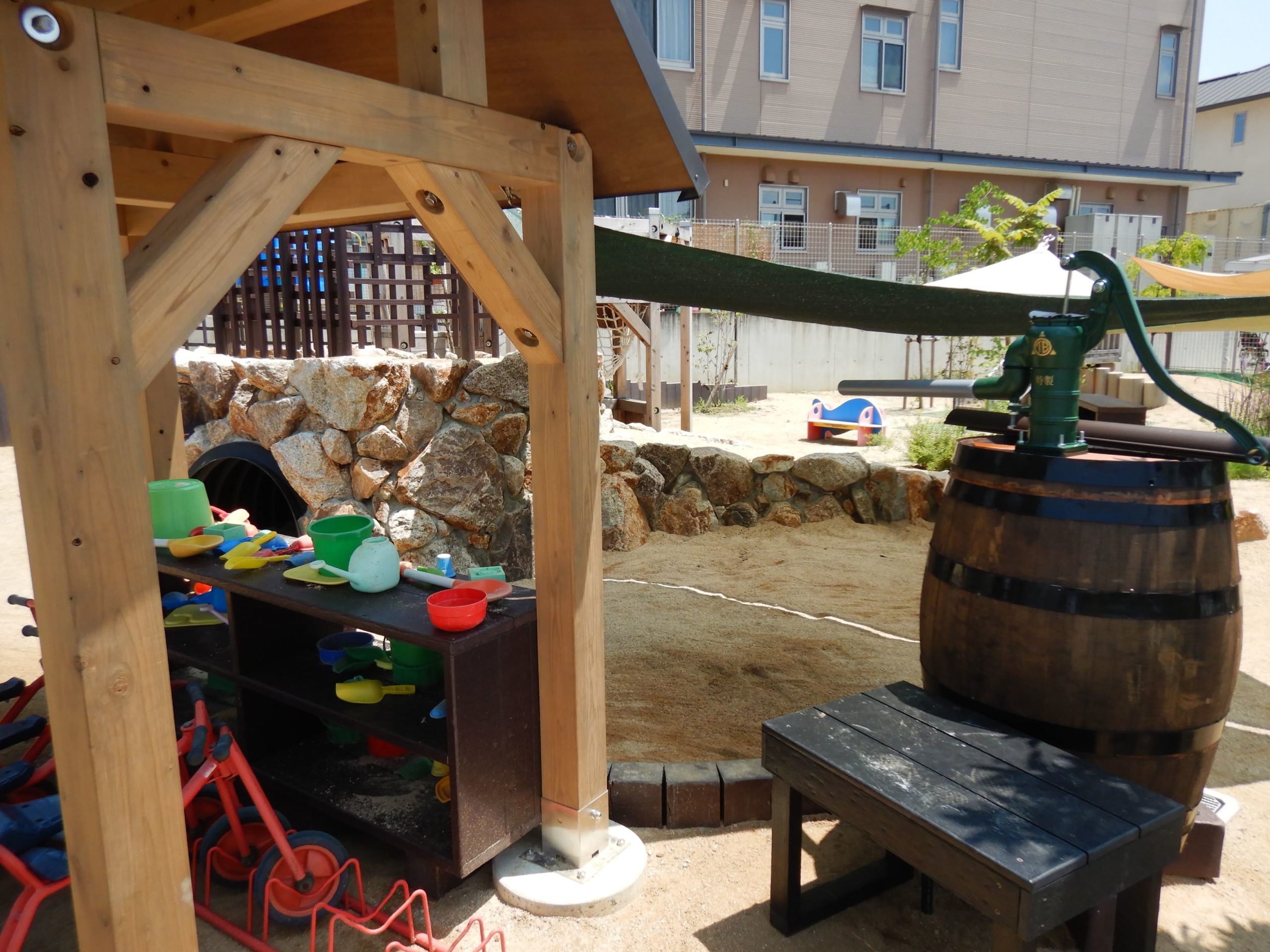 今回の工事ではがちゃぽんポンプで水遊びを楽しめる砂場がメインでした。
