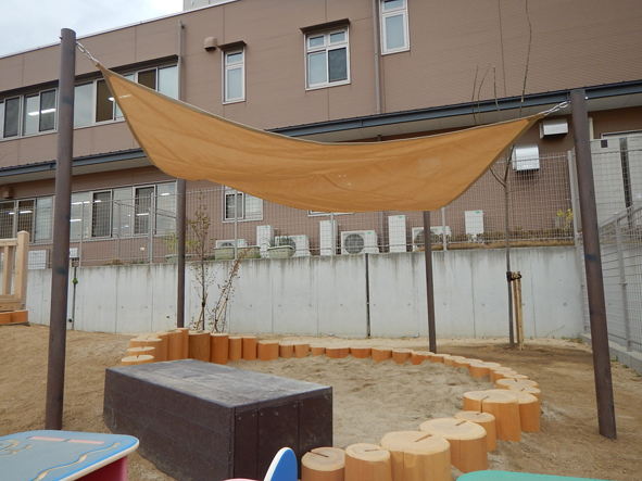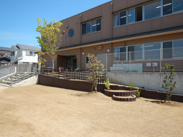 今回の第一期工事では、乳児クラスの砂場と滑り台遊具の設置や植栽を行いましたが、