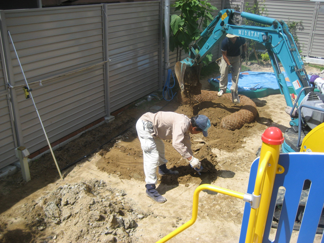 まずはじめに、粗造成等を工事として行い、その後日、遮水シート張りから仕上げまで、年長・中の子どもたちと一緒に作業しました。
