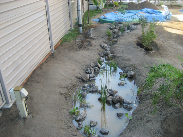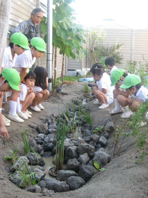 園庭の隅の小さな畑を身近な生きものがやってくる水辺のビオトープにつくり変えました。