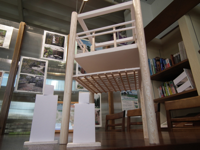 園庭の中央部に鎮座する木製の遊具は、左下の写真の通り、昨年9月から模型を使って検討を重ねた甲斐あって、予想通りのいい仕上がりになりました。