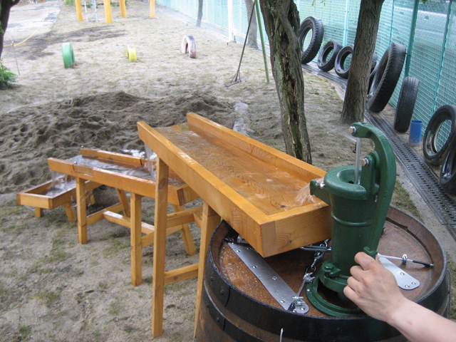 右下の写真は、雨水を使ったどろんこ遊びの仕掛けです。ガチャポンポンプから水を受けるカウンターは、高さがそれぞれ違って、かつ自由に動かすことができるので、みんなで協力しあって、ダイナミックなどろんこ遊びが楽しめます。