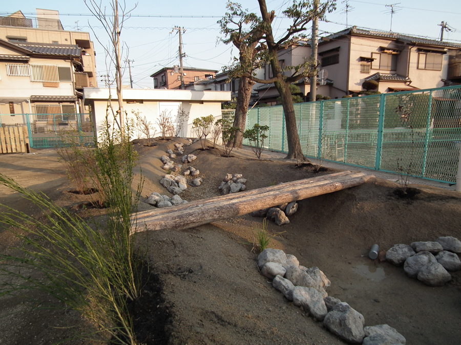 ビオトープ池の築山にはオニグルミ、滑り台の築山にはネムノキ・スモモ・イチジクの樹木を植え、その近辺には、季節の灌木をたくさん植えました。