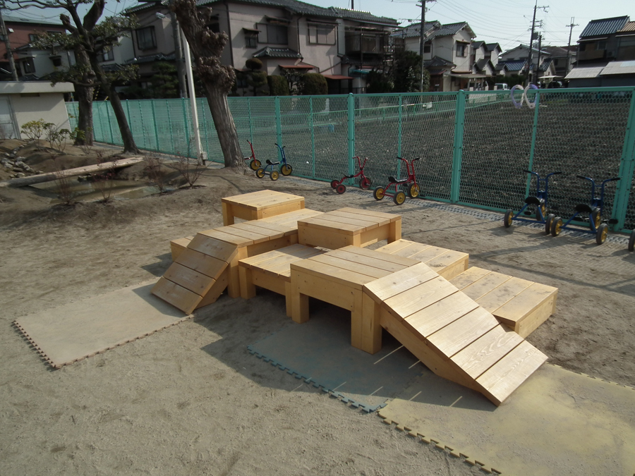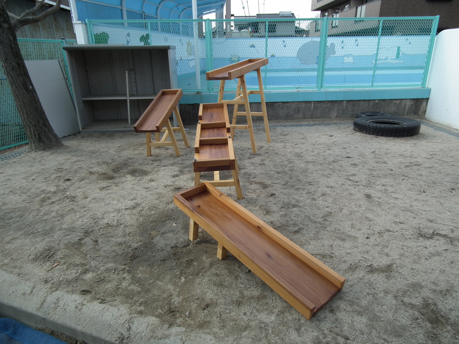 上段右と下段左の写真は、それぞれ段差テーブルと水遊びカウンターと呼んでいる遊具です。いずれもバラして動かすことができるので、工夫次第で色んな遊びが楽しめます。水遊びカウンターは、今後二期工事の中で、雨水とのコラボを計画しています。乞うご期待。