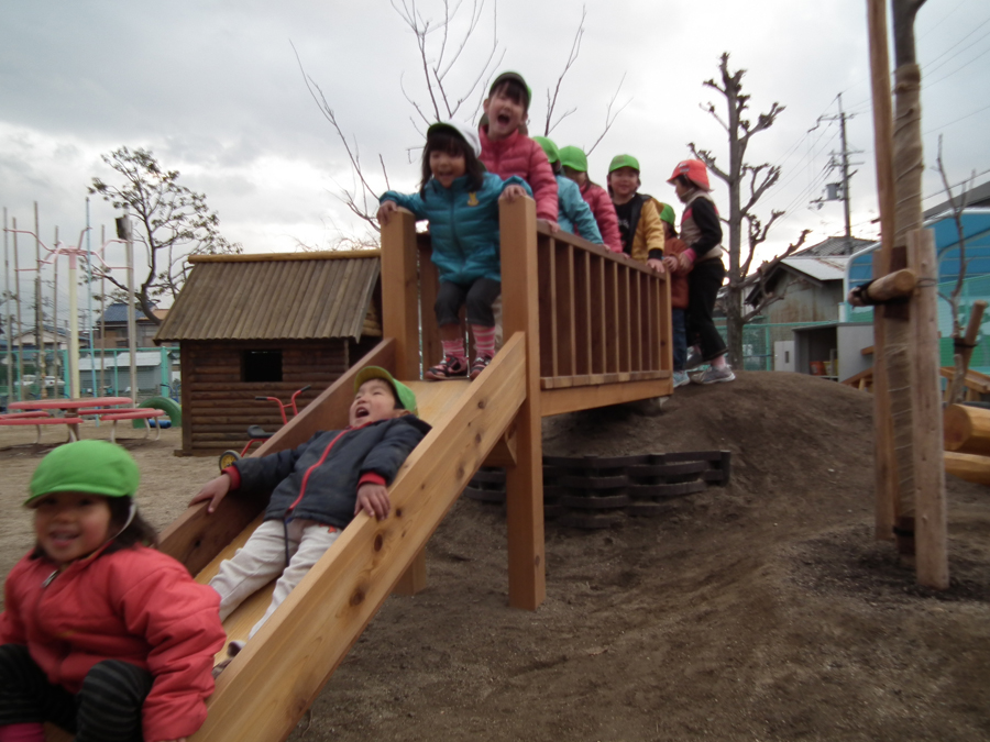 下段右の写真は、主に乳児クラスの子どもたちが遊ぶ滑り台です。その横には、丸太の遊具もあります。