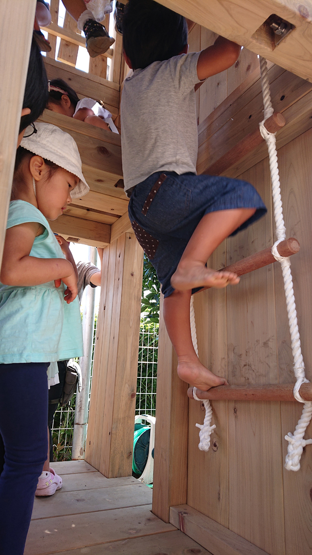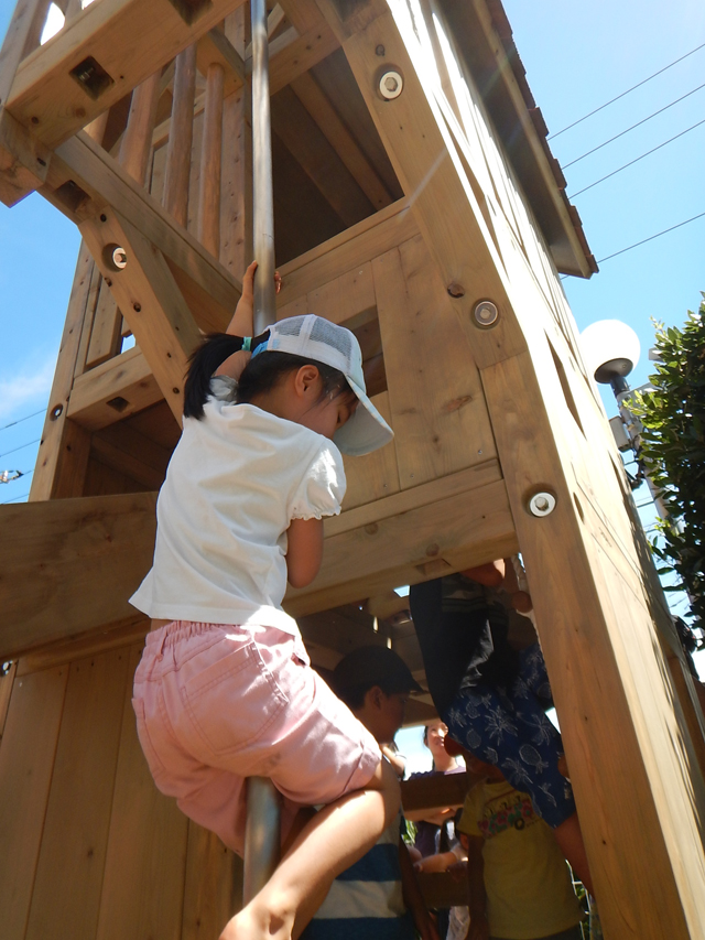 そして、その上がり方に工夫が凝らされた滑り台付きの木製遊具を設置しました。