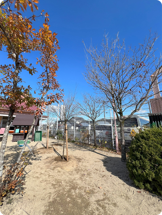 同年12月には、季節の花木(コブシ・サルスベリ)や果樹(ビワ)、その他にも、ケヤキ、エゴノキ、ナンキンハゼを植え、夏になれば木陰をつくる、緑豊かな遊び場をつくりました。