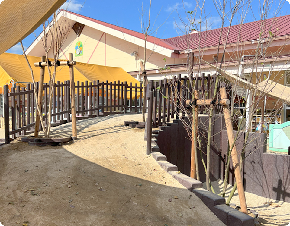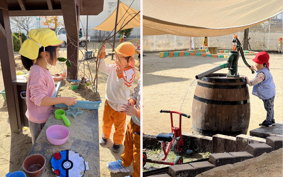 古くなった大型遊具を撤去し、築山と砂場やどろんこ遊び場をつくり、 それらの遊び場の中には、水遊びができるがちゃぽんポンプやごっご遊びが広がる小屋を設置しました。