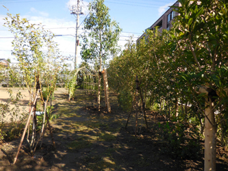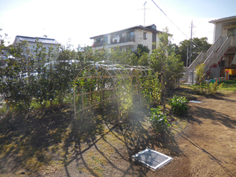 そうして、今回第一期の園庭づくりとして、高木ではクスノキ他、ヤマモモ・カリン・ブルーベリーを、低木では10種類37本の四季折々の花木などを植えました。また、竹で組んだものにレンギョウを誘引させたトンネルも作りました。