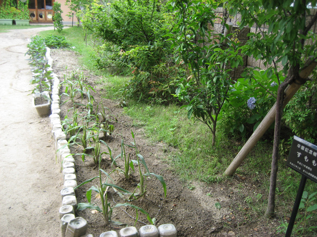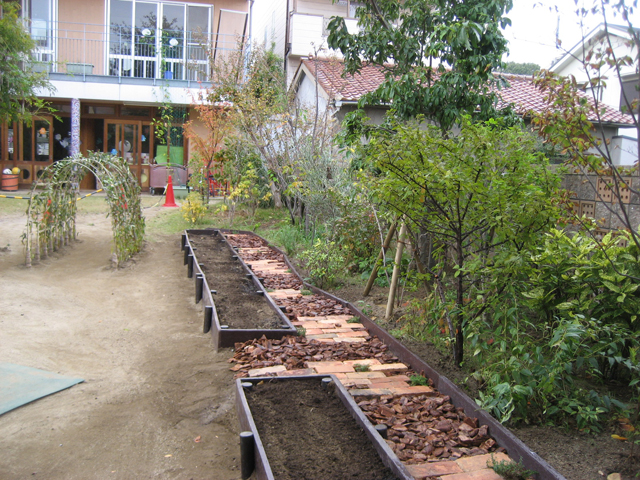 「畑は小さくしたくない」「畑をこれ以上園庭側に伸ばしたくない」という要望がありながら、畑を確保しつつ、畑横にこみちをつくりました。