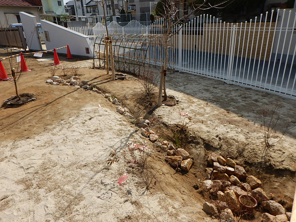 今回の工事では、大阪府みどり基金を活用して、ハーブガーデンでの苗の植え付け、果樹等の樹木の植栽、ビオトープ池周辺の芝張りや水生植物の植付けを子どもたちとその保護者、先生たちと一緒に行いました。