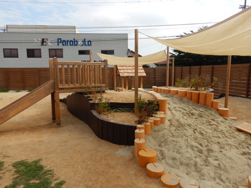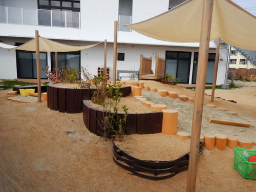 丸太のひょうたん型砂場を中心に全体的に起伏のある園庭となりました。