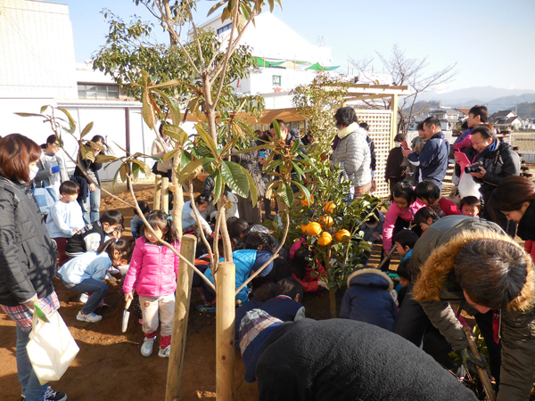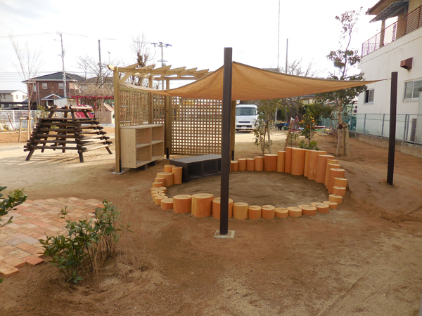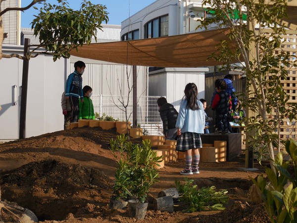 以前は、平坦なグランドとしての利用がメインだった園庭の一角に、砂場を中心に小さな築山などがあり、その周りには色んな果樹も含め、緑に囲まれた自然と触れ合える環境を整えました。